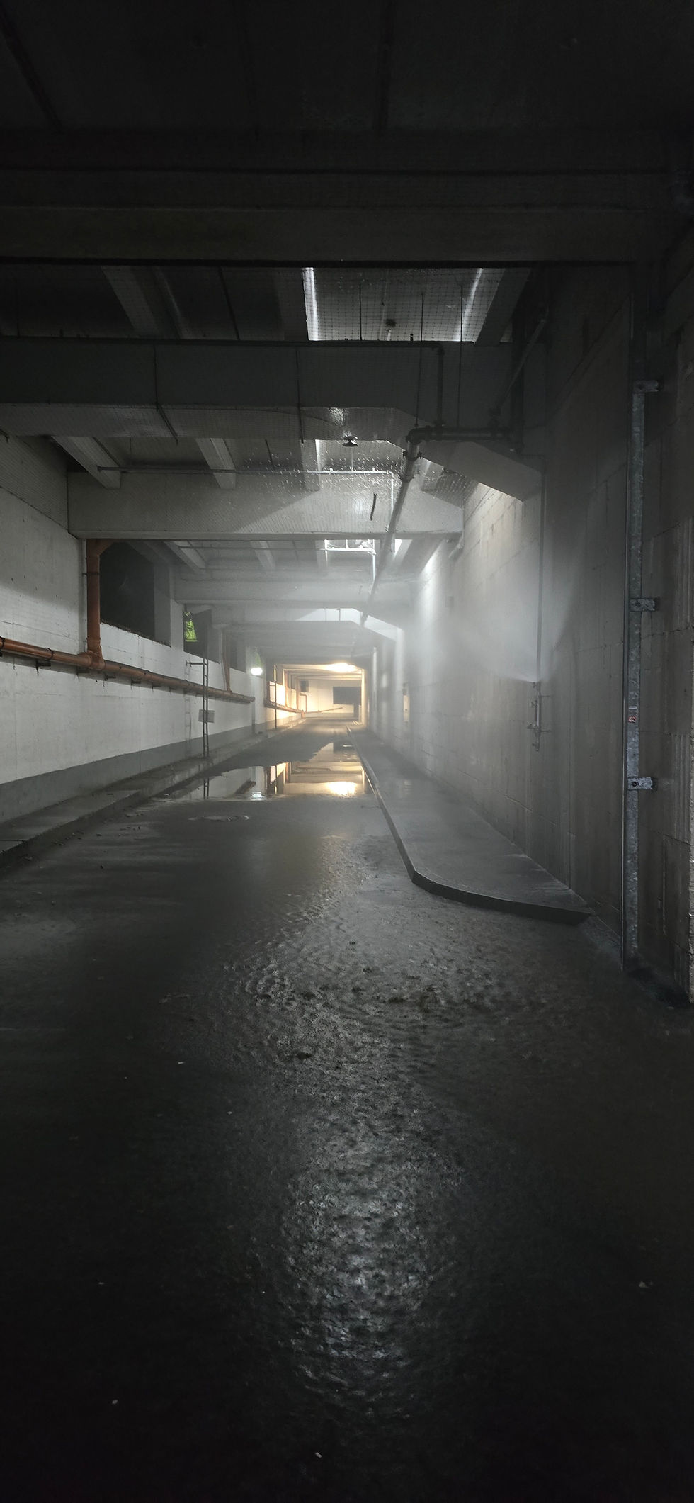 Vor Ort zeigte sich, dass es sich nicht um einen Brand handelt, sondern um einen witterungsbedingten Schaden an der Sprinkleranlage.